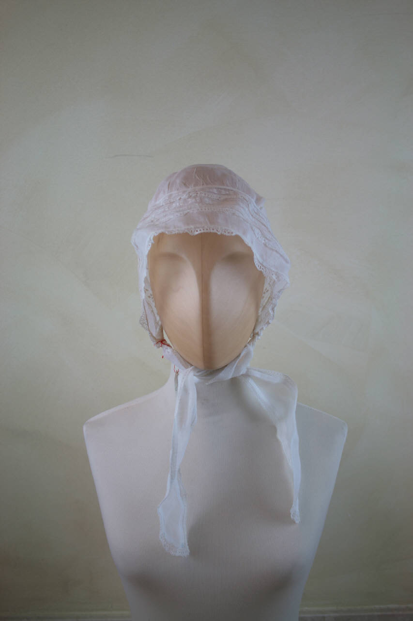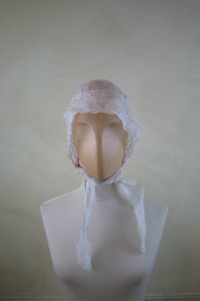 Cuffia in tela bianca, con tesa anteriore decorata da ranghi di merlettini, effetti di sfilature (ottenuti con armatura garza) e ricami in bianco. Agli angoli anteriori due lunghe briglie da annodare e sul dietro coulisse con cordoncino.