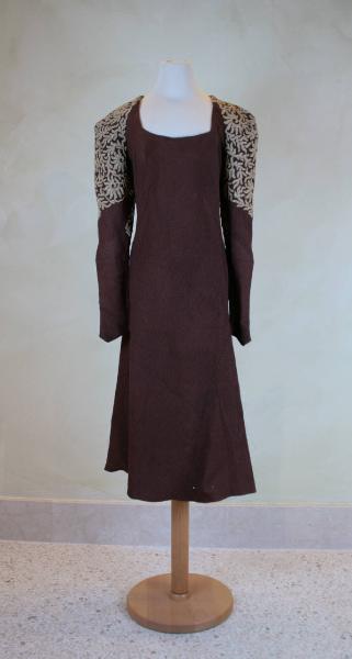 Abito princesse lungo al polpaccio, in crespo goffrato marrone, con ricami a macchina sulla parte alta delle maniche, con applicazione di cordoncino in seta avorio e filo dorato, che descrive rami tipo corallo e fitte semicorolle spiraliformi. L'abito è modellato mediante inserti sbiechi sul davanti e diversi sul dietro e leggermente svasato al fondo. Scollo quadrato sul davanti e a V sul dietro; maniche a raglan, lunghe a coprire la mano, larghe in alto e aderenti dal gomito al polso. Sulle cuciture laterali passanti in filo subito sotto il punto vita per cintura ora perduta.