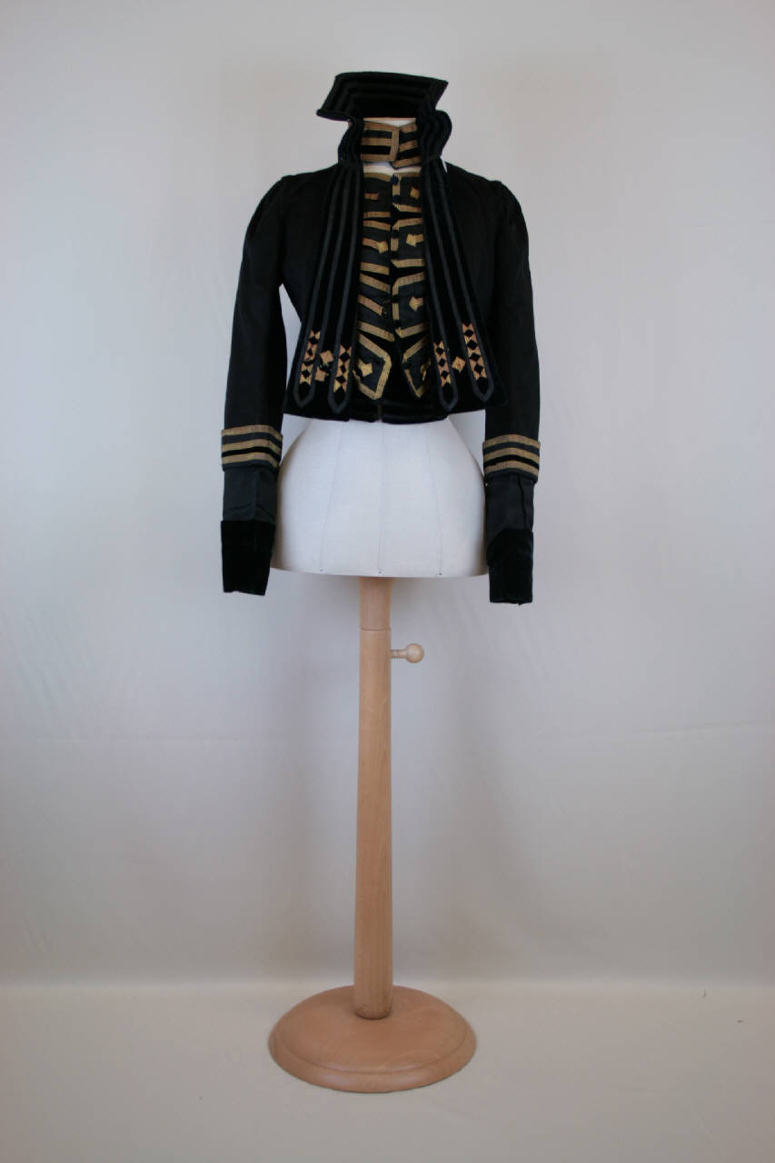 Giacca aderente, corta in vita, in panno nero. Alto collo in velluto nero con cinturino che sul davanti forma collo interno chiuso da 2 bottoni. Mostre in velluto ripiegate all'esterno, decorate come il collo da nastri in taffetas nero e motivi triangolari e romboidali in nastro giallo rigato in rosso (orditi in seta gialla e rossa, trama in oro trafilato). Le mostre sono aperte su pettorina in velluto con bande orizzontali in gros nero, chiusa da 7 bottoni rivestiti e occhielli corrispondenti. Le bande in gros sono profilate dal nastro rigato giallo e rosso che forma finti alamari. La giacchina è stretta in vita, sul davanti, da alta cintura in velluto con nastrini neri, chiusa al centro da ganci. Dietro in 4 pezzi, con dorso triangolare terminante con piccola coda con piega a cannone, sottolineata da finta martingala profilata dal nastro rigato. Maniche lunghe a gozzo, arricciate in alto; confezionate con finte maniche a tre quarti con paramano in velluto da cui proseguono sottomaniche più strette in gros con alto polsino in velluto, chiuso da 2 coppie di bottoni a gemello.\nFodera in raso avorio. All'interno, al centro dietro, etichetta in nastro operato.
