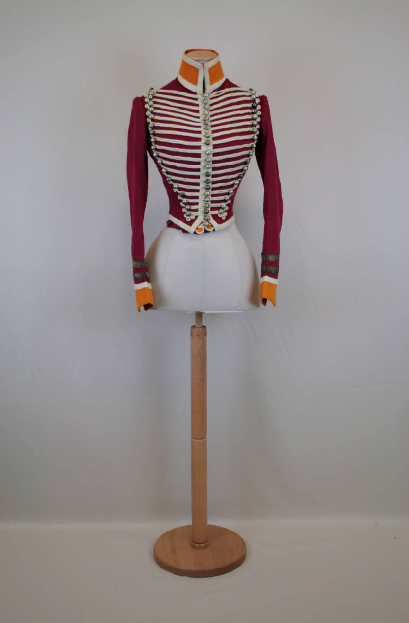 Giacca dolman, aderente, in panno rosso magenta. Alto collo in panno arancio, apertura centrale chiusa da 21 bottoni semisferici in metallo argento. Dietro attillato con dorso triangolare in due pezzi e 4 fianchette; breve spacco centrale. Maniche lunghe, sagomate con bordo arancio al fondo. Collo, apertura, orlo e cuciture del dorso profilate da nastro ad intreccio diagonale di lana bianca. I quarti anteriori sono fittamente ricoperti da 19 alamari in treccia sottile di lana bianca decorati originariamente da 2 file per lato di 19 bottoni argentati: ora presenti solo le file verso i fianchi. Sulle maniche motivo a V capovolta reso da 2 giri di gallone argentato. Fodera in taffetas rosso magenta; controfodera in tela di lino. \nCappello a berretto con lunga punta, nello stesso panno, in 4 spicchi con cuciture coperte da cordoncino argentato. Alto bordo in pelliccia bianca; punta terminante con nappa in canutiglia argento. Fodera in taffetas bianco. Pennacchio, ora staccato, con ciuffo bianco (rachidi di piume?) stretto da fascetta in seta bianca rossa e blu lavorata ad ago, base rivestita in canutiglia argento e perno in metallo.\nAll'interno della giacca etichetta in tela stampata e completata a mano. Sulla controfodera iscrizioni in matita blu.