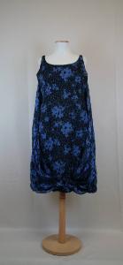 Abito senza maniche, lungo al ginocchio, in crespo stampato con motivo a corolle azzurre poco definite su fondo a macchie blu-nero. Di linea diritta, modellato in vita da pinces, con scollo ovale. Davanti in un pezzo, dietro in 4 pezzi con cerniera sul fianco sinistro. Sul dietro è fissato allo scollo un ampio pannello in sbieco dello stesso tessuto, arricciato, che scende fino al fondo dove è rimborsato e cucito all'interno dell'orlo. Le due estremità laterali sono portate davanti, dove sono riunite presso l'orlo con finto fiocco,creando un effetto a palloncino. Fodera in taffetas nero, con pesi nell'orlo. All'interno nel fianco sinistro etichetta in nastro operato.
