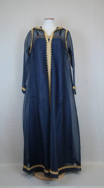 Abito lungo modello caftano con cappuccio, in crespo blu, decorato ai bordi e al centro davanti da passamaneria a telaio giallo e avorio. Apertura al centro davanti con cerniera. Sottabito separato, in taffetas blu, con scollo totale profilato dalla passamaneria e sottili spallini.