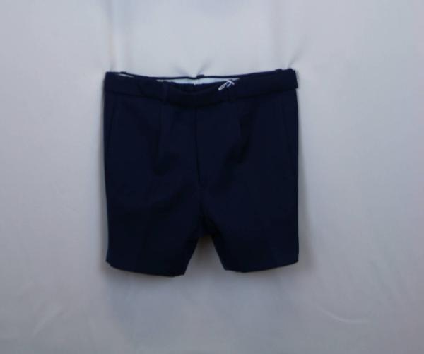 Pantaloni cortissimi con bretelle in diagonale blu. Alti in vita, senza cintura e all'interno asole in elastico per bretelle. Passanti nei quali è infilata una cinturina nello stesso tessuto, chiusa da automatici. Patta verticale anteriore con cerniera. Sui fianchi tasche a filetto. Totalmente foderati in diagonale celeste.