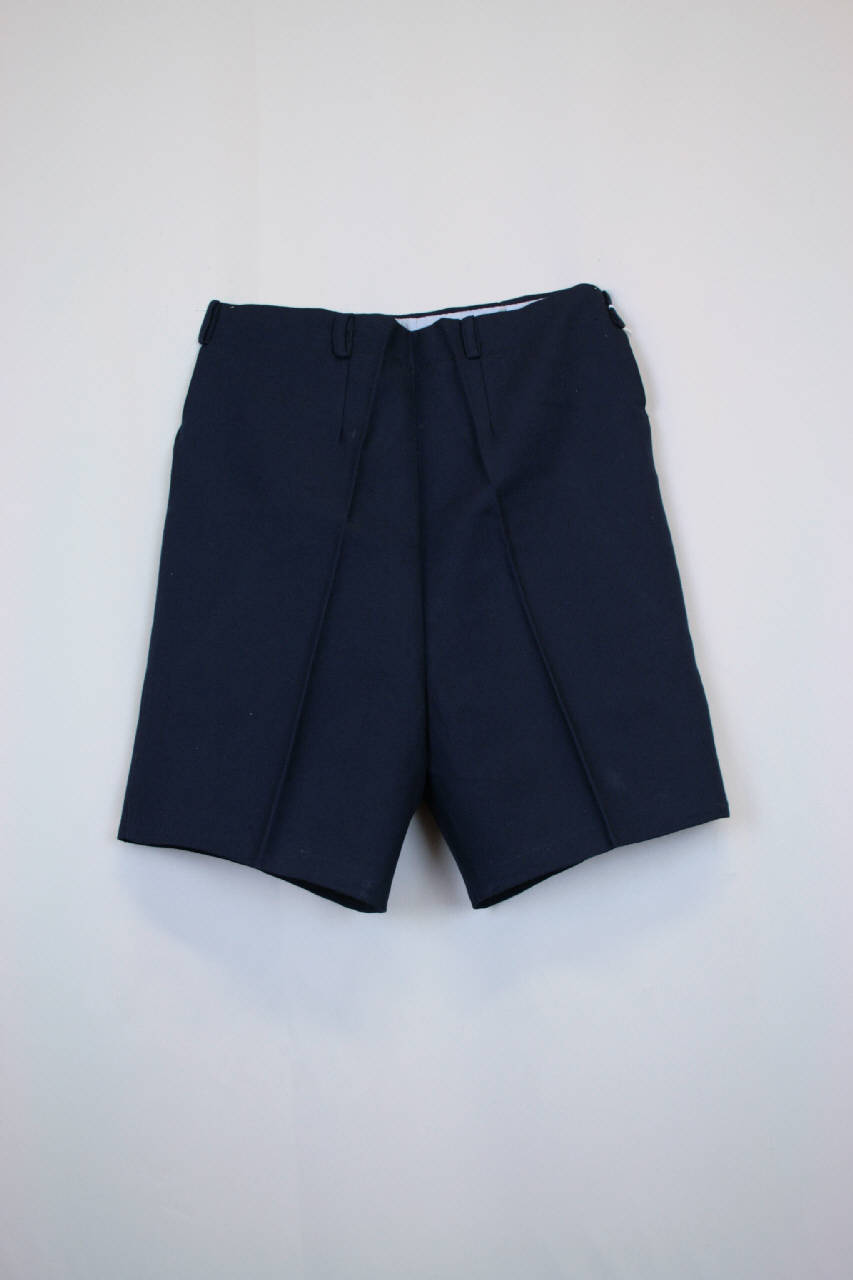 Pantaloni corti sopra al ginocchio in diagonale blu. Davanti e dietro uguali, alti in vita, senza cintura e con asole in tela per bretelle, aperture sui fianchi con automatici. Passanti per cinturina non presente. Fodera in tela grigia.