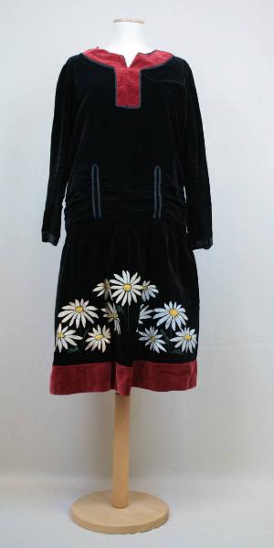 Abito a vita bassa, lungo al polpaccio, in velluto nero con alto bordo allo scollo e all'orlo in velluto rosso. Corpino con davanti in un pezzo, di linea diritta; scollo rotondo con breve apertura al centro. Sui fianchi due arricciature verticali, sul davanti e sul dietro, creano drappeggio; le arricciature sono decorate da doppio nastrino in gros nero. Gonna in due teli, arricciata; sul davanti decoro dipinto a grandi margherite bianche con cuore giallo e foglioline verdi. Fodera-sottabito nel corpino in tela nera.