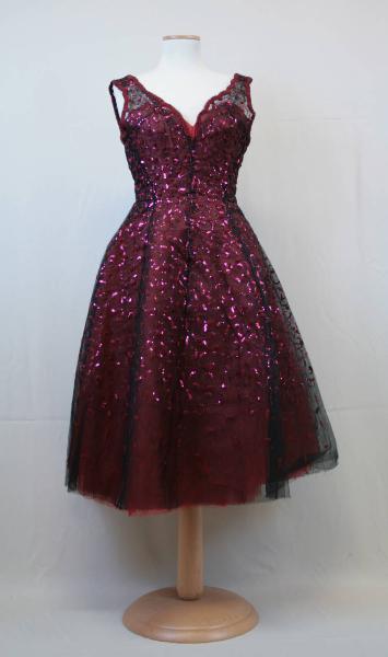 Abito princesse senza maniche, molto svasato, in doppio strato di tulle nero. Lo strato interno è ricamato a motivo labirintico con paillettes e nastrini di velluto fucsia. Profondo scollo a cuore, corpino aderente con teli che si prolungano a formare la gonna svasata. Apertura con cerniera al centro dietro. Sottabito in taffetas rosa con scollo totale e stecche, doppiato all'interno con tela nera e all'esterno in tulle rosso che forma gala arricciata presso l'orlo.