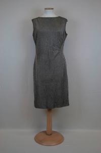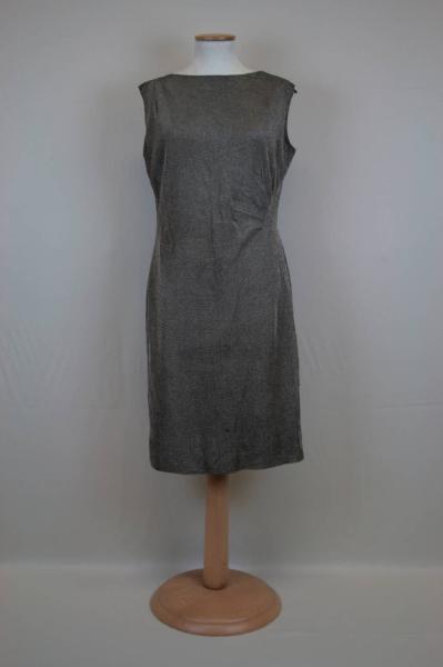 Abito di linea diritta,senza maniche, lungo sotto il ginocchio. In jersey color bronzo laminato argento, davanti in un pezzo, con scollo a barca, modellato da tre pieghe sulla spalla destra e gruppo di pieghe a raggiera sul fianco sinistro. Dietro in due pezzi con cerniera centrale. Fodera in taffetas bruno-grigio.