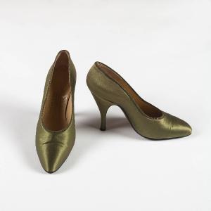 Abbinate all'abito scarpe décolleté con tomaia e tacco alto a spillo foderati in raso verde, con bordino alla scollatura in gros verde, sottopiede e fodera in pelle rosacea, suola in cuoio.