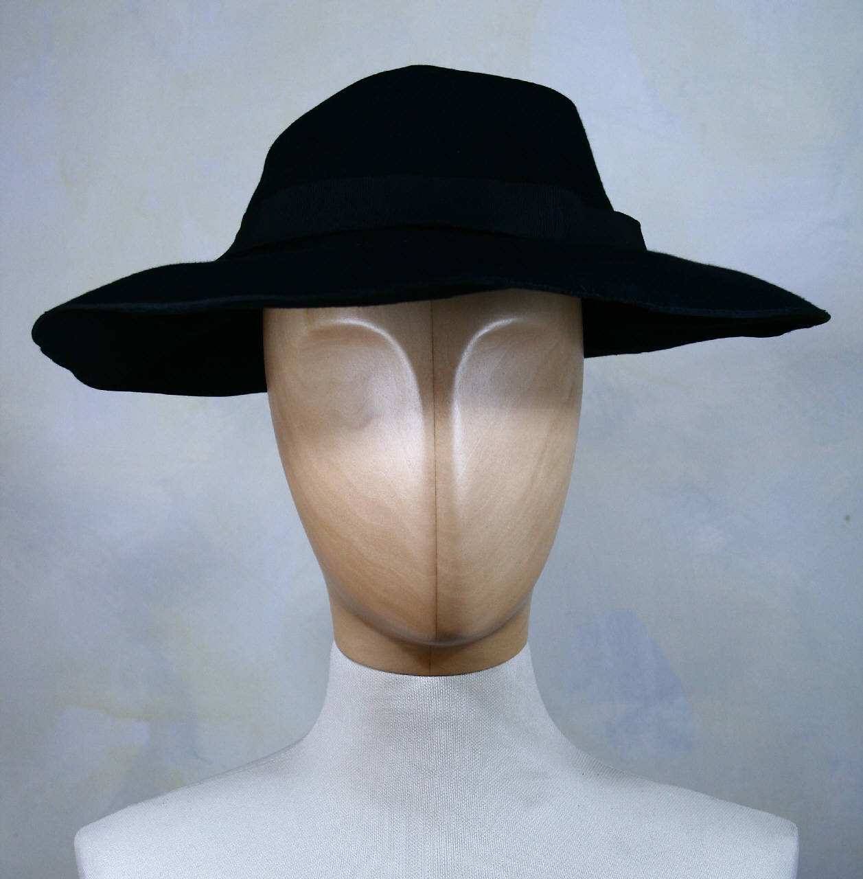 Cappello in feltro nero ad ampia tesa ovale, con calotta bassa sagomata presso la cima da profonda piega. La giunzione tra tesa e calotta è coperta da nastro gros nero che forma fiocco piatto sul dietro. Tesa profilata da nastro gros nero che racchiude ferrino. Giro d'entrata perduto.