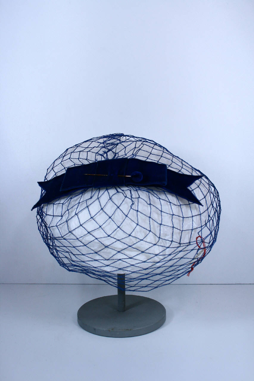 Acconciatura formata da veletta circolare color blu elettrico, fermata sulla cima da fiocco piatto in nastro di velluto blu. Spillone con testa rivestita nello stesso velluto. Al rovescio etichetta in nastro operato.