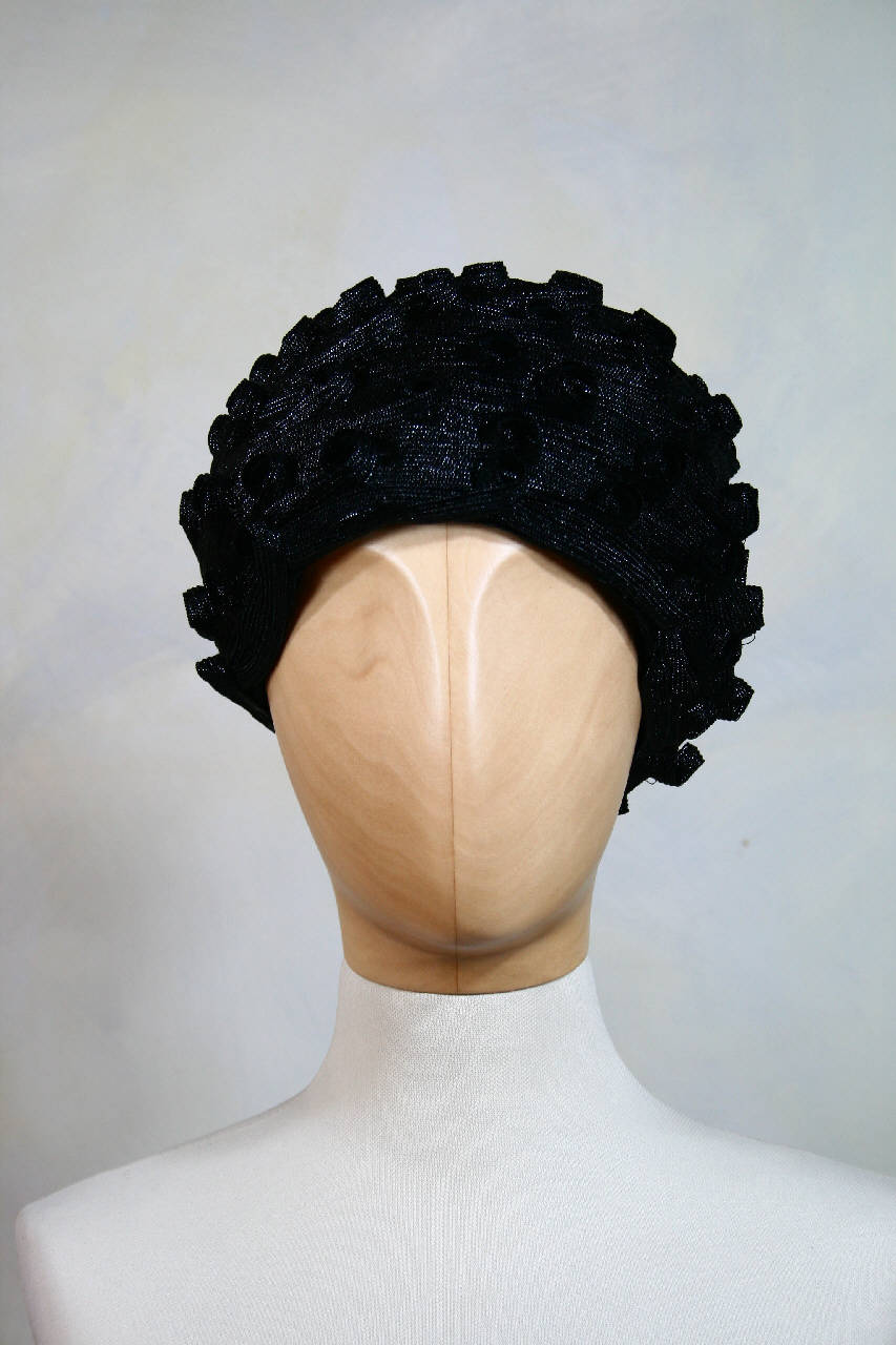 Cappello a toque con calotta a cupola in rete di filato sintetico nero, fittamente ricoperta da nastrino in paglia nera (sintetica) cucito a spirale. Il nastrino forma sulla superficie piccoli occhielli circolari disposti a scacchiera. Giro d'entrata in nastro gros nero. All'interno, dietro, etichetta in nastro operato.