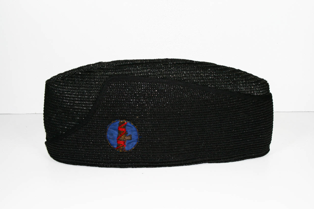Cappello a bustina in nastrino di paglia nera, cucito a spirale. Alette laterali rovesciate in alto, profilate da nastrino nero, con smusso nella parte anteriore. Sul lato sinistro è applicato l'emblema del Fascio Littorio ricamato in filato metallico su fondo in tessuto azzurro. Giro d'entrata in pelle nera.