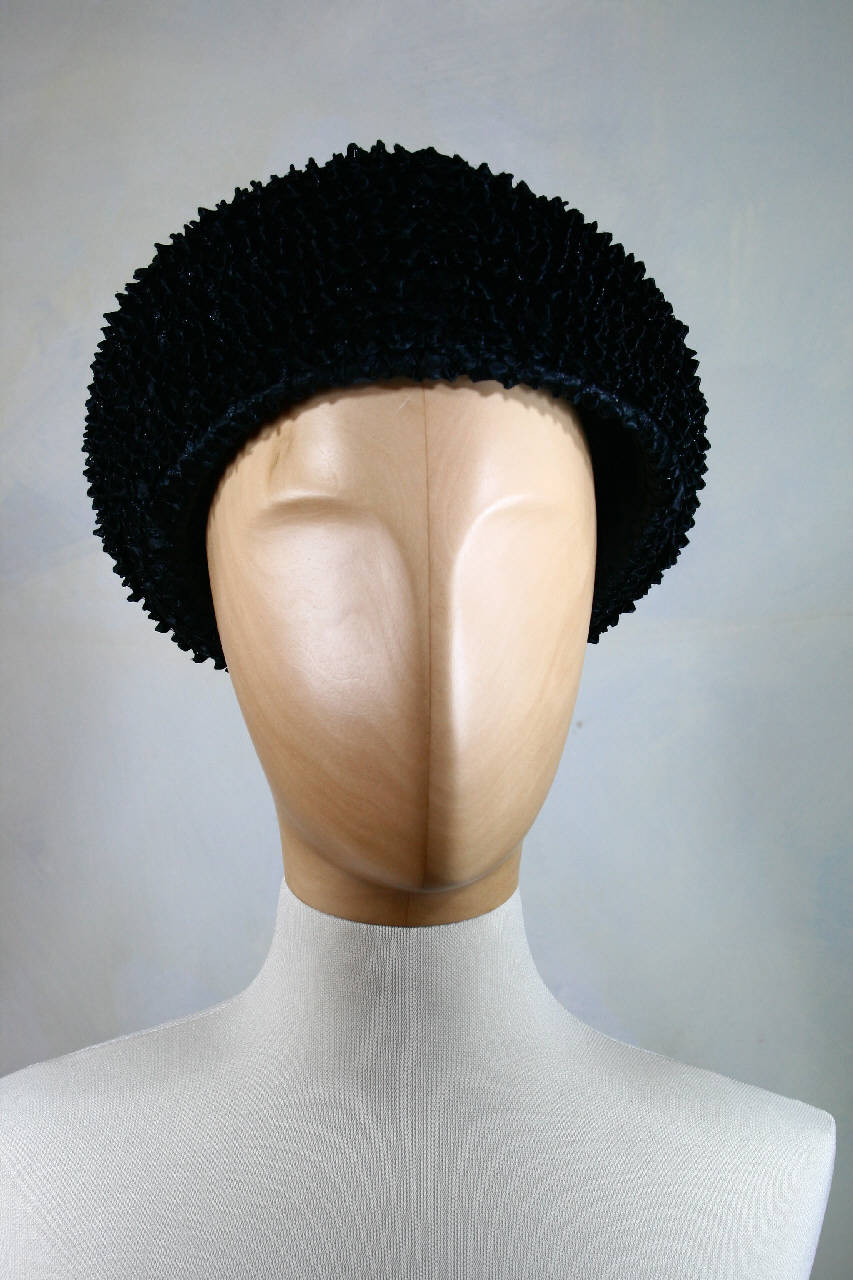 Cappello casque in paglia nera, lucida e opaca, intrecciata a formare piccole cuspidi rigide. Sulla cima è inserito a spirale, alternato ai giri a cuspidi nere, un nastrino di paglia naturale. Piccole bozze, davanti e dietro, trattenute internamente da nastro gros nero cucito. Struttura in tulle rigido nero; giro d'entrata in nastro gros nero. All'interno, sul davanti, etichetta in nastro stampato.