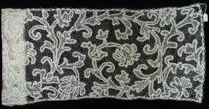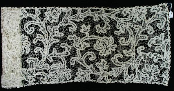 Alto bordo in cotone bianco, ad ago, formato da nastrino continuo tessuto a telaio, con margini traforati, fermato da fondo ad ago a rete tortillèe e diversi riempitivi ad ago all'interno dei motivi definiti dal nastrino. Decoro ad ampi girali d'acanto con foglie e bocci, desinenti in iris volti alternativamente in direzioni opposte. Lungo i bordi è cucito uno stretto merletto a fuselli in cotone bianco, suggerendo un uso come stola o elemento d'arredo.