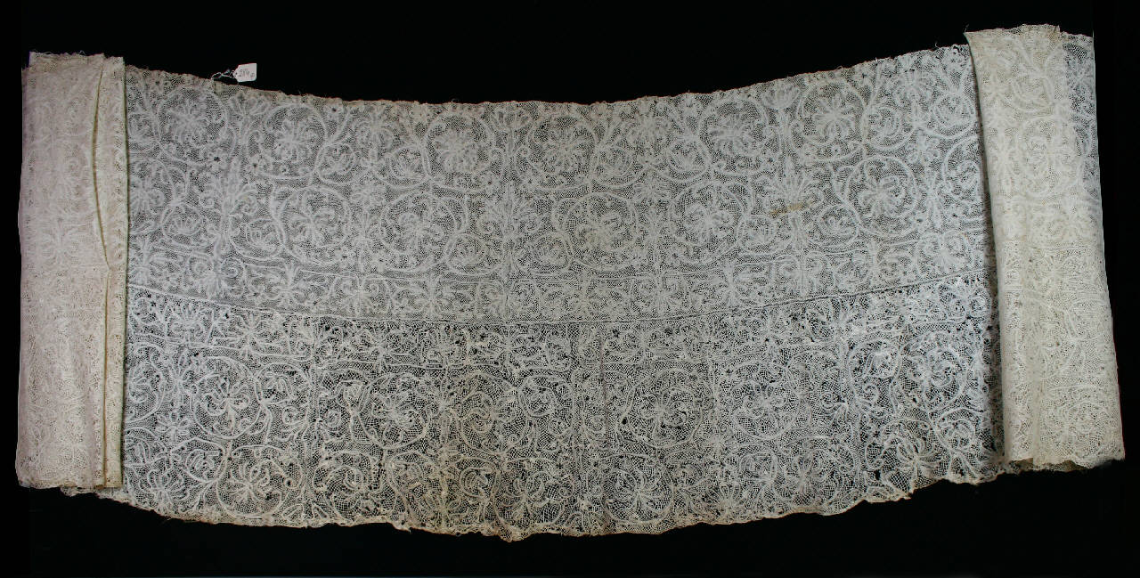 Balza chiusa per rocchetto liturgico, formata da due bordi in merletto con stesso disegno, giuntati orizzontalmente in modo speculare. Entrambi sono in lino bianco, ma in due spessori diversi, a fuselli a fili continui, del tipo Milano. Motivi a nastrino continuo a punto tela con margini traforati, su fondo a rete torchon a maglie quadrangolari. Ogni bordo è realizzato a moduli separati poi uniti tra loro. Il modulo decorativo è strutturato in due ranghi di girali tipo acanto, legati con un anello ad iris centrale; i girali sostengono iris e tulipani. In basso, delimitata da una sottile cornice lineare, alternanza di iris e mazzetti di tre tulipani, volti alternativamente in alto e in basso e collegati da volute.