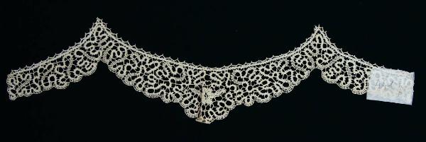 Bordo a forma di festone, per applicazione su abito, in merletto di lino naturale, a fuselli a fili continui (tipo Cantù): motivi a nastrino continuo a punto tela e mezzo punto, con picot, legato da barrette a treccia, e con riempitivi a mezzo punto. Disegno labirintico che evidenzia, al centro del bordo, un fiore a sei petali con due foglie.