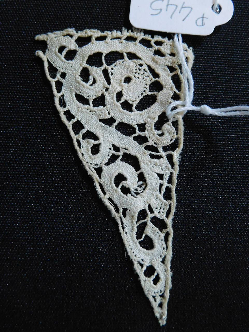 Elemento triangolare in merletto di lino naturale a fuselli (tipi Cantù) a fili continui, con nastrino a punto tela e collegamenti a barrette. Girale che genera una piccola melagrana.