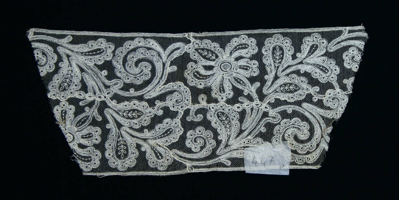 Frammento di merletto in cotone bianco, con fondo in tulle bobbinet meccanico, ricamato a macchina. Motivo a morbidi girali d'acanto, con foglie e bocci e desinenti in fiori tipo iris: il modulo è ripetuto con orientamento alterno.