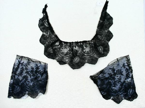 Collo e polsi per abito o camicia femminile in merletto con un margine tagliato e uno smerlato, in cotone nero, meccanico ad imitazione del tipo Blonde, con fondo in tulle bobbinet e punto Parigi. Grandi corolle con cuore a melagrana insistono negli smerli maggiori; sono alternate a foglie d'acanto nascenti dalla corolla e piccolo fiore che si dispone nello smerlo più piccolo. Nella parte alta steli con fiorellini e foglie. Il merletto è tagliato e cucito per realizzare i polsi, mentre per il collo è arricciato.
