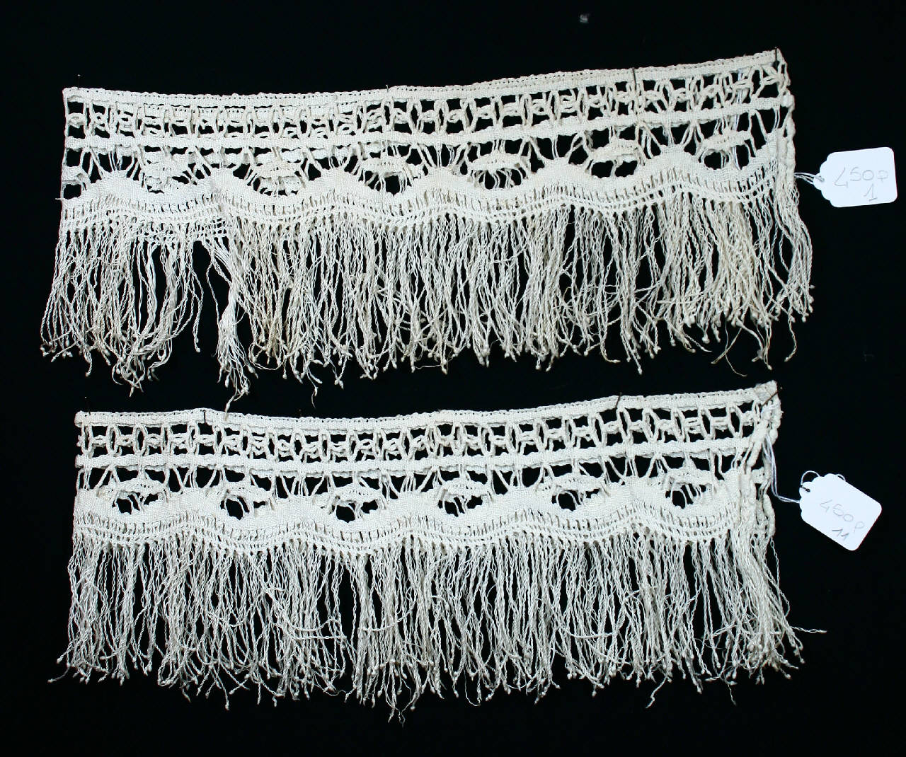 Due bordi uguali in merletto meccanico di cotone bianco, ad imitazione di merletto a fuselli del tipo torchon. Un margine diritto, l'altro leggermente smerlato con alte frange.