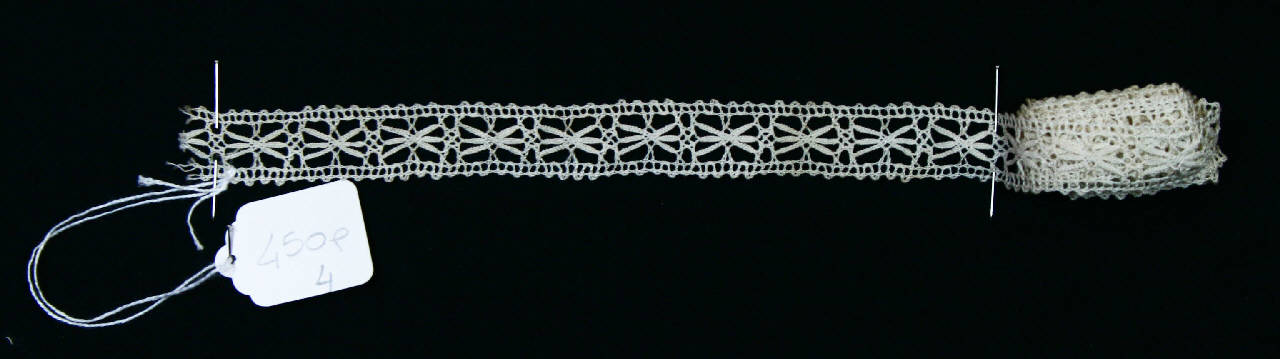 Tramezzo in merletto meccanico di cotone bianco, ad imitazione di merletto a fuselli del tipo torchon. Decoro a motivi stellati ad armelette.