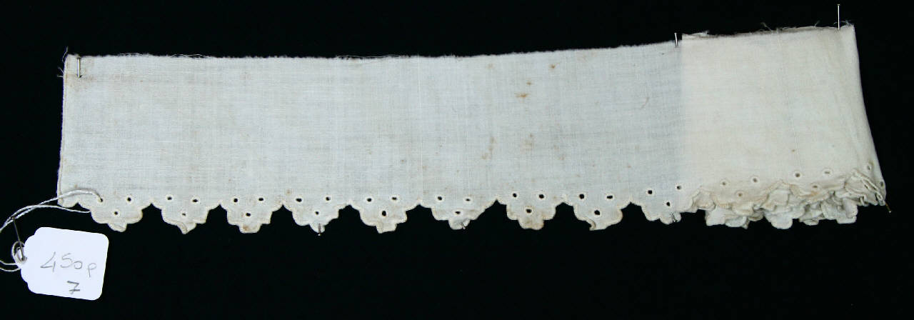 Tela bianca ricamata a macchina ad imitazione pizzo Sangallo. Piccole punte smerlate decorate da tre pois forati.