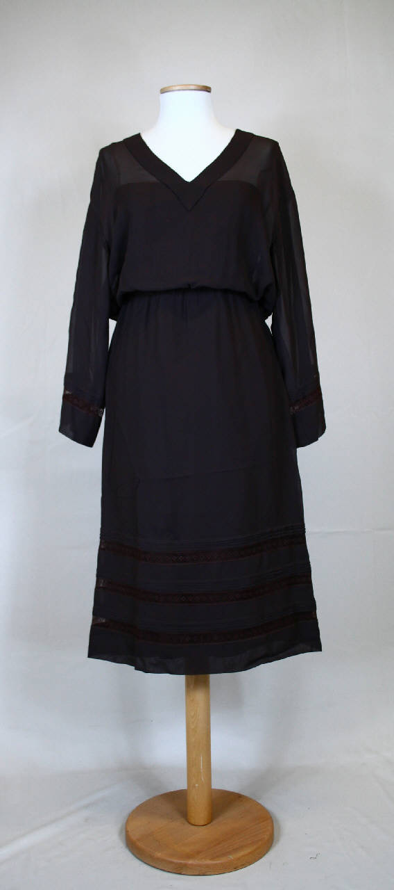 Abito di linea morbida, lungo al polpaccio, in crespo marrone. In un telo per il davanti e uno per il dietro. Scollo a V profilato nello stesso tessuto, in vita coulisse con elastico passante; apertura al centro dietro chiusa fino alla vita da 10 bottoncini rivestiti e con asole in tubolare dello stesso tessuto, cerniera sotto la vita. Spalle calate, maniche lunghe diritte, larghe. Al fondo delle maniche e all'orlo sono inseriti tramezzi di merletto marrone compresi tra gruppi di piccole pieghe parallele cucite. Sottabito in taffetas marrone, con spallini in fettuccia nocciola (sostituiti) chiuso dietro da cerniera. Nel sottabito, all'interno nel fianco sinistro, etichetta in nastro operato.