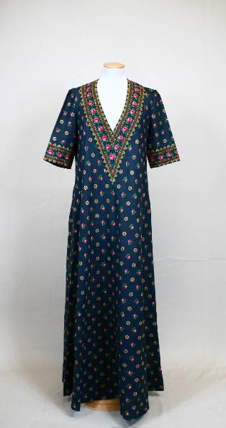 Abito lungo alla caviglia, in leggera tela grigio petrolio, stampata a teorie di roselline rosa e fiori gialli. Linea svasata, con un unico telo sbieco per il davanti e uno per il dietro, con inserti sbiechi aggiunti nella parte alta. Scollo a V e maniche diritte al gomito, profilati da banda nello stesso tessuto, stampata a bordura con analoghi motivi floreali. Tasche a sacchetto inserite nelle cuciture dei fianchi; apertura al centro dietro con lunga cerniera. All'interno, nel fianco sinistro, etichetta in nastro operato.