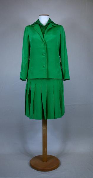 Completo formato da giacca e gonna in crespo verde brillante e camicia abbinata in damasco (filato crespo, seta?) nello stesso colore a minuto disegno. Giacca lunga ai fianchi, davanti in due pezzi con lunghe pinces, dietro in due pezzi. Collo a risvolti, apertura chiusa da tre bottoni rivestiti nello stesso tessuto. Maniche lunghe, diritte, in un pezzo. Fodera in taffetas verde. All'interno,nel fianco sinistro, etichetta innastro operato.\nGonna a pieghe (ogni piega è un telo) con cinturino impunturato. Apertura posteriore centrale chiusa da cerniera e ganci. Camicia di linea aderente, con collo a punte, chiusa da otto bottoni rivestiti nello stesso tessuto e occhielli corrispondenti a punto occhiello. Maniche lunghe, in un pezzo, con spacco al fondo e polsino chiuso da un bottone.