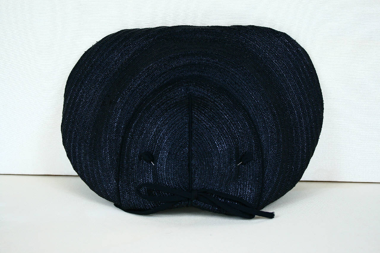 Cappellina in paglia nera a calotta molto bassa, segnata al centro e al bordo da nervature in gros nero. Tesa sagomata cuoriforme, con sottotesa in parte in paglia e in parte rivestita in gros. Sul dietro, sagomato per accogliere lo chignon, fiocco in tubolare dello stesso gros. Fodera della calotta in tulle rigido nero, giro d'entrata in nastro gros nero. All'interno, al centro dietro etichetta in nastro operato. Sul dietro sono inseriti due spilloni con testa rivestita in gros nero.