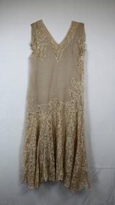 Completo formato da abito e giacca, con numerosi ritagli, in crespo nocciola e merletto meccanico nocciola. Abito senza maniche, con scollo V davanti e dietro, di linea diritta lungo alla caviglia. Percorso da fitte nervature orizzontali impunturate. Inserti di merletto nel bordo scollo e asimmetricamente sulla spalla destra e lungo il fianco sinistro. All'altezza dei fianchi è inserita asimmetricamente un'alta balza in merletto, arricciata e smerlata al fondo. Giacca in merletto, lunga poco oltre la vita, in un unico pezzo. Girocollo, chiusa allo scollo da un bottone a gemello. Maniche lunghe, diritte, rifinite al fondo da borso a smerli in crespo; nella cucitura della manica è inserito presso il fondo un lembo triangolare che pende all'esterno. Sottabito in crespo avorio-giallo, con spallini e bordo all'orlo nel crespo dell'abito. Tra i ritagli allegati, un fiocco in crespo con lunghe cocche e la profilatura di un'abbottonatura con fitti bottoncini rivestiti e occhielli in cordoncino applicati ad una striscia di crespo sagomata a smerli; brani di merletto e crespo.