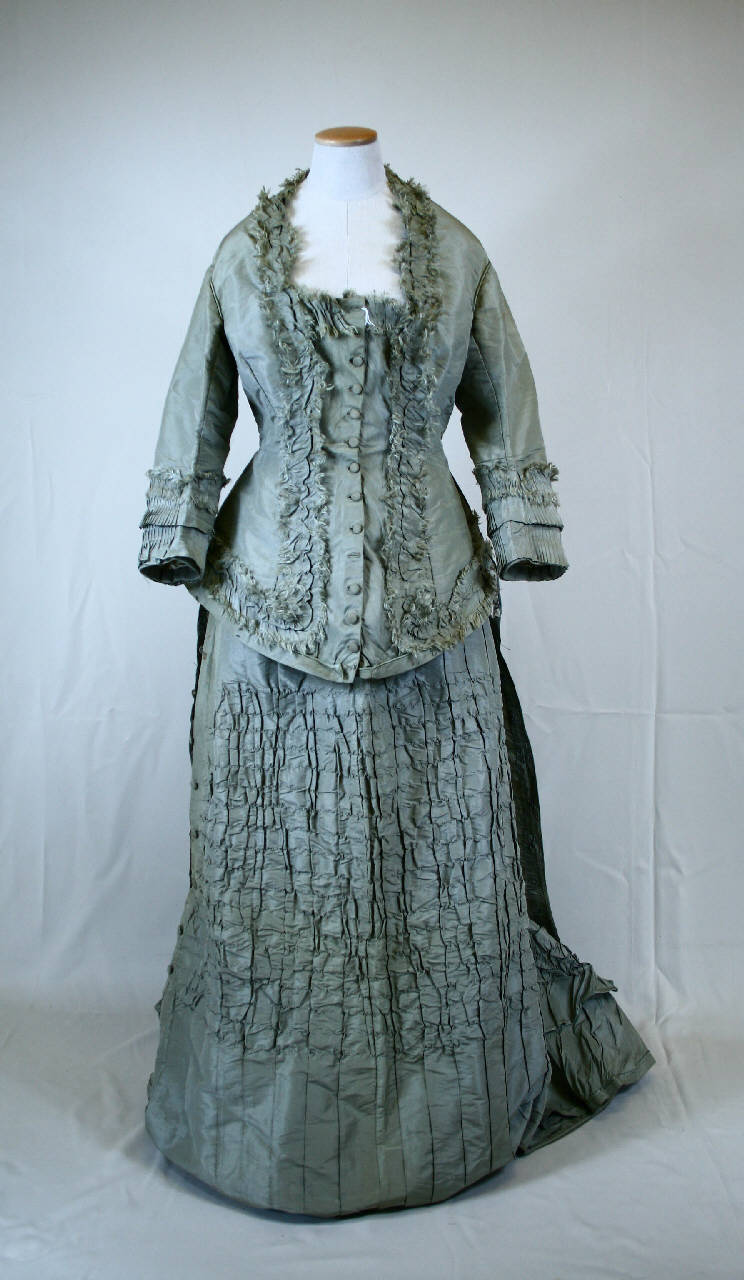 Completo composto da giacca e gonna lunga in taffetas verde acqua. Giacca aderente lunga ai fianchi, ampio scollo quadrato, apertura con 13 bottoni rivestiti (dei quali 2 perduti) e occhielli a filetto. Davanti in più pezzi con falde svasate: le parti centrali sono intere dallo scollo al fondo, rimaneggiate prob. per allargare il capo; le parti laterali presentano pinces e taglio in vita. Dorso in 4 pezzi con taglio in vita, e due fianchette prolungate fino all'orlo della gonna e svasate da gherone. Spalle calate, maniche a tre quarti, in due pezzi, al fondo due giri di ruche pieghettata. Scollo, apertura, orlo e maniche decorate da ruche nello stesso tessuto, arricciata e con margini sfilacciati. Sul dietro sono applicate alle falde due lunghe bande: la sin. decorata da increspature verticali e ruche all'orlo, la des., liscia, riporta una tasca applicata decorata da fiocco (aggiunta). Nei profili di bande e orlo punti recisi in filo nero fanno supporre la presenza di decorazioni asportate.\nGonna asimmetrica con lungo strascico stondato (tournure). Diritta sul davanti, con ampiezza raccolta sul dietro e trattenuta all'interno da elastici. L'ampiezza del davanti è raccolta da piegoline in alto e presso l'orlo: nella zona intermedia è arricciata da ranghi di filze. (segue in AN)