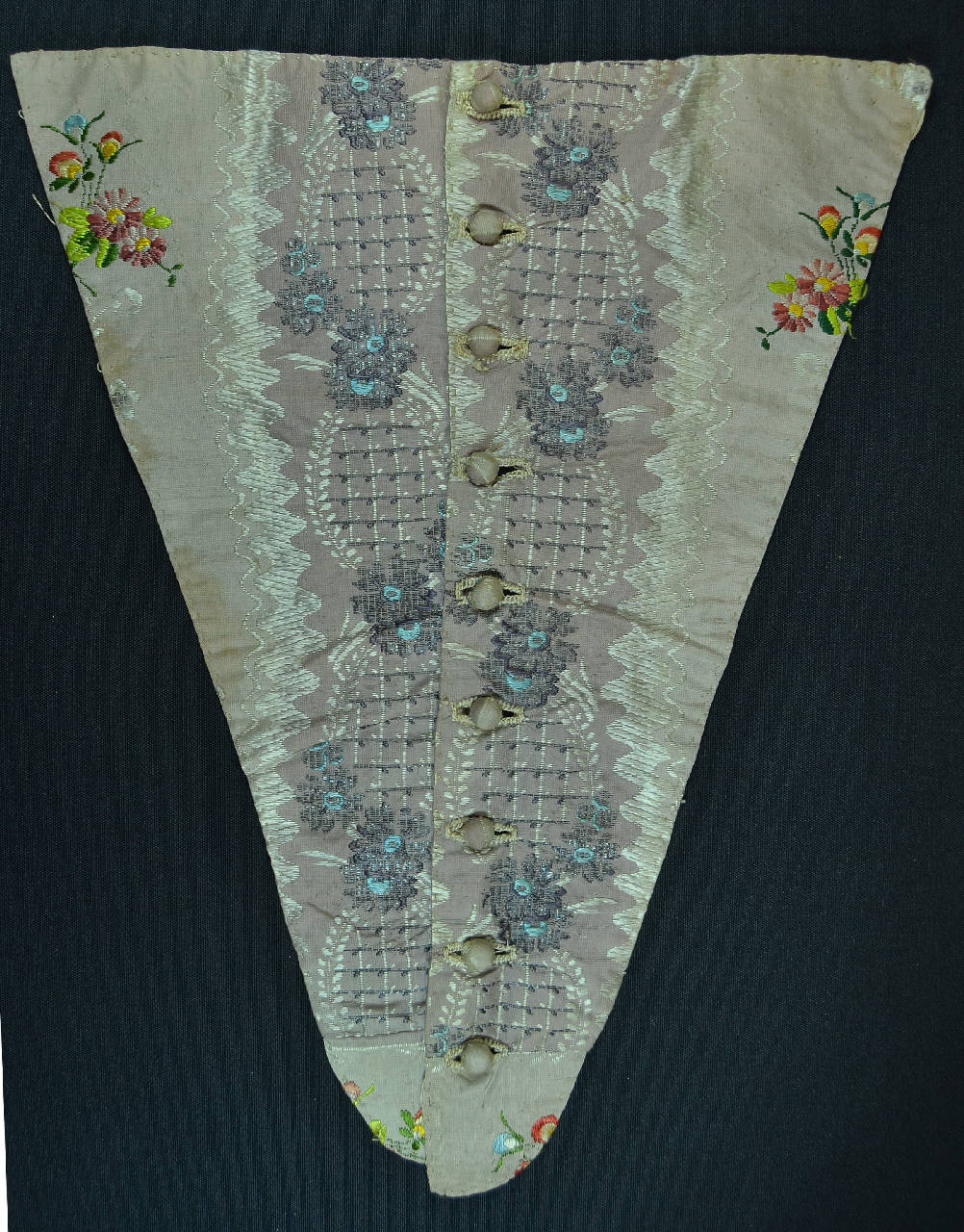 Compares di corpino che formano una sorta di pettorina triangolare, chiuse al centro da 9 bottoni rivestiti con occhielli corrispondenti. I bottoni sono posizionati a destra e gli occhielli a sinistra. Confezionato in gros de Tours operato a liage repris, lanciato, broccato, con fondo a larghe rigature lilla chiaro e scuro, separate da sottili nastri a serpentina bianchi, lievemente ondulanti. Nella riga scura successione di medaglioni ovali a riquadrature, definiti da tralci bianchi a piccole foglie, sostenuti da fiori argento e azzurro. nella riga chiara, parzialmente visibile, si intuiscono mazzolini di fiori policromi.\nLa punta è data da due piccole giunzioni dello stesso tessuto, cucite con orientamento opposto.\nFodera in tela bianca.\nSi rilevano le tracce del fissaggio delle due parti al corpino.