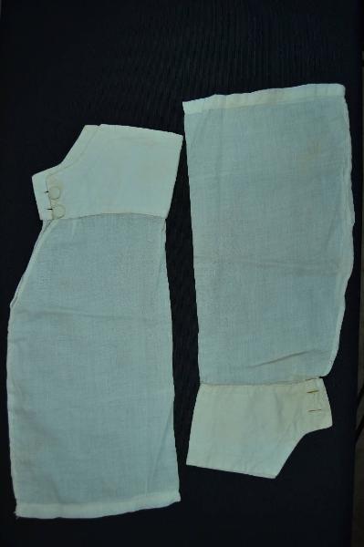 Paio di sottomaniche in tela bianca, in un pezzo, diritte e chiuse al fondo da polsino rigido, con risvolto sagomato.Chiusura a due bottoni rivestiti nello stesso tessuto e occhielli a p. festone. \nLe sottomaniche coprono l'avambraccio.