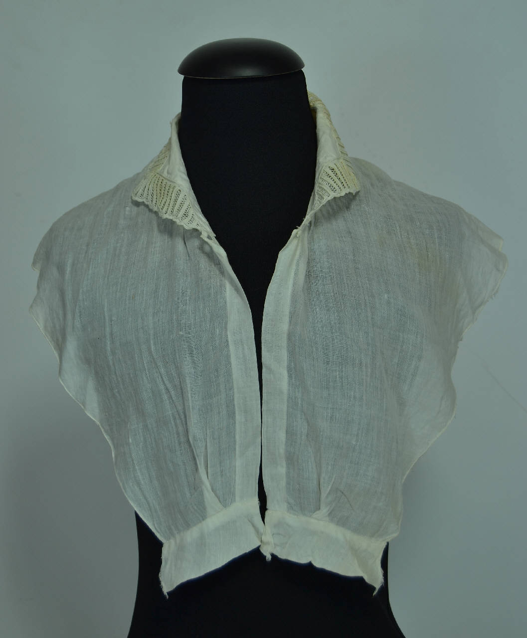 Chemisette in tela bianca, apertura anteriore chiusa al collo da bottone (perduto) e occhiello. Al fondo, davanti e dietro, passante a coulisse mancante della fettuccia. Piccolo scollo a cinturino con risvolti a punta sul davanti, profilato da banda in tela bianca con ricamo meccanico ad effetto di sfilature.