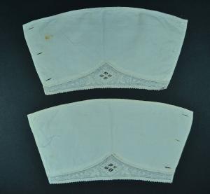 Paio di polsini in tela bianca, svasati, decorati al bordo da inserto sagomato, con ricamo meccanico in bianco, con piccoli fiori e foglie. Chiuso da 3 bottoni (perduti) e 3 occhielli.