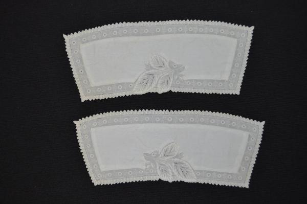 Paio di polsini in tela bianca, decorati su tutti i lati da applicazione in tela bianca più sottile, ricamata a p. pieno, filza, cordoncino e punti tirati che creano effetti di sfilature. Al centro del lato verso l'esterno è ricamato un ramoscello con grandi foglie; bordi a minute punte. Chiuso da 2 bottoni (perduti) e 2 asole nascoste all'interno.
