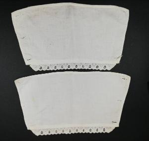 Paio di polsini svasati in tela bianca, decorati al bordo esterno da bordo applicato in tela bianca con ricamo meccanico tipo Sangallo. Chiusi da tre bottoni (perduti) e occhielli.