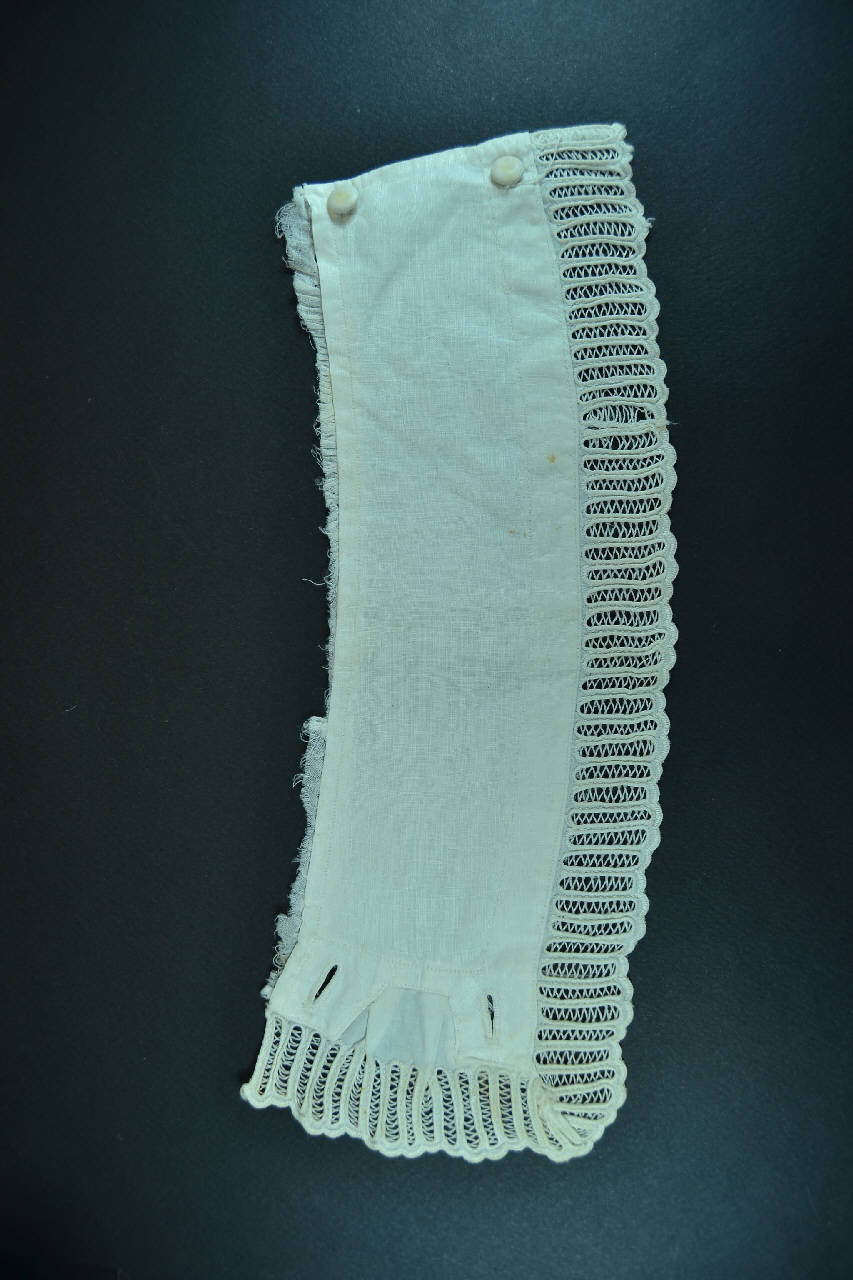 Polsino destro bianco, rettangolare, doppio, a due bottoni rivestiti nello stesso tessuto e occhielli a p. festone. Profilato da banda in tela bianca ricamata a intaglio con effetto di sfilature.