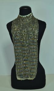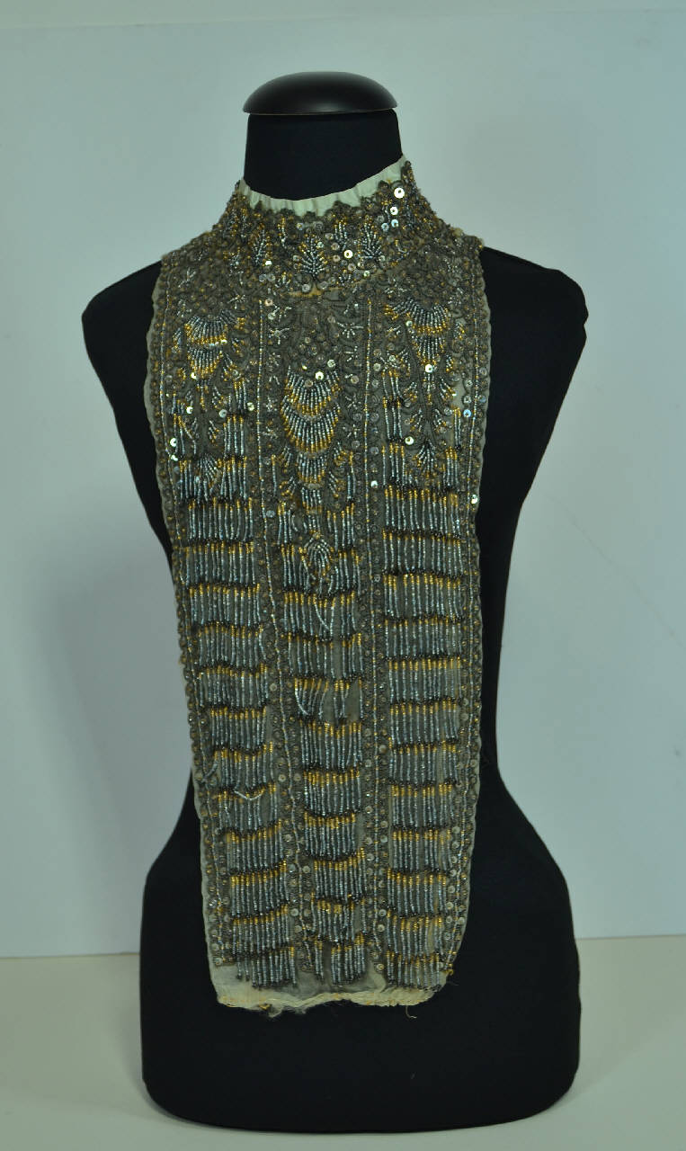 Pettorina o parte anteriore di abito femminile, in crespo grigio chiaro, con collo alto a cinturino, profilato da nastro marezzato grigio perla, che forma, dietro, una coccarda a fiocco. Il collo è chiuso dietro da tre ganci; altri ganci sono cuciti sul lato sinistro e suggeriscono la posizione dell'apertura dell'abito. Arricciata al fondo, presso il punto vita.\nFittamente ricamata con cordoncino a più capi blu, celeste e oro, paillettes in metallo argentato, perline di vetro argento e oro. Decoro a tre bande verticali separate da cornici: in alto in ogni banda un grande motivo boteh capovolto genera frange di perline poste a cascata. Motivi boteh più piccoli decorano il collo.