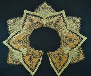 Gala decorativa a grandi punte triangolari per ampia scollatura ovale di abito femminile. In tulle avorio bobbinet ricamato a tambour work meccanico, sul quale è applicato velluto tagliato lilla chiarissimo che forma un motivo a punte più interno e profila con motivo frastagliato le punte in tulle. Il tulle è ricamato e decorato da perline sfaccettate in vetro avorio dorato. Sul velluto ricami in jais e perline di vetro nero in varie misure e forme, che delineano in ciascuna punta uno stelo con foglie e tulipano.