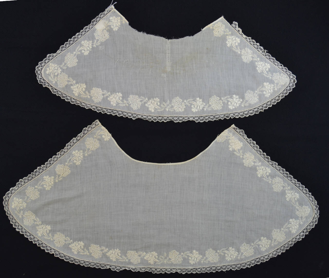Due grandi colli in tela bianca, analoghi ma uno più piccolo, probabilmente sovrapponibili. Lungo il bordo ricamo in cotone bianco a p. pieno, cordoncino e passato tirato che crea effetti di sfilature: andamento ondulante di mazzolini di fiori a petali cuoriformi alternati a ciuffi di foglie a goccia, perlinate. Profilati da merlettino a fuselli a filo continuo, bianco, con fondo a rete tipo Lille, decoro a p. de Paris e profili resi da filo più spesso.