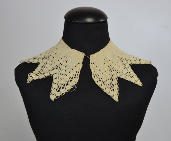 collo avorio eseguito all'uncinetto, a maglia bassa, alta e catenella. Formato da grandi smerli triangolati decorati da due file di elementi tondeggianti.