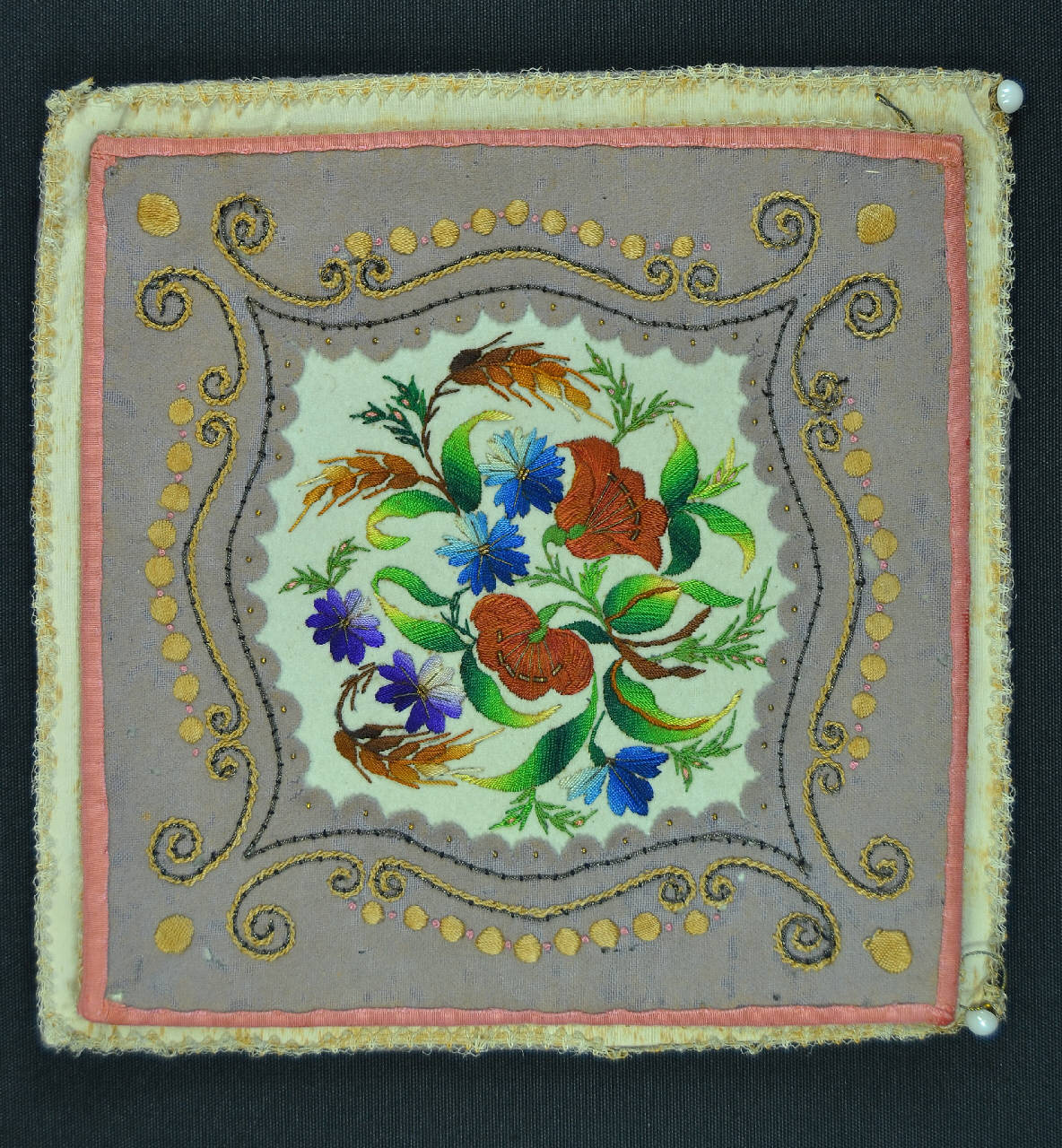 Portafazzoletti da due elementi quadrati, con esterno in panno glicine e interno in taffetas avorio, con incluso supporto rigido. I quadrati sono uniti agli angoli da asole e bottoncini in madreperla (due perduti e sostituiti da punti incongrui). L'elemento superiore, leggermente più piccolo, ha una finestra centrale, smerlata e profilata da cornice a linee e perlinature a p. posato, erba, piatto e nodi, con cordoncino in argento (?) filato, seta nocciola e rosa, in cordonetto policromo e perline dorate. Nel campo interno in panno avorio è ricamato un mazzo di papaveri, viole, fiordalisi e spighe a p. erba, piatto e lanciato; paricolari in canutiglia e oro filato. Nel lato interno superiore sono ricamate le iniziali SC in seta gialla e oro filato. Bordi in nastro di seta rosa e sottile merlettino meccanico.