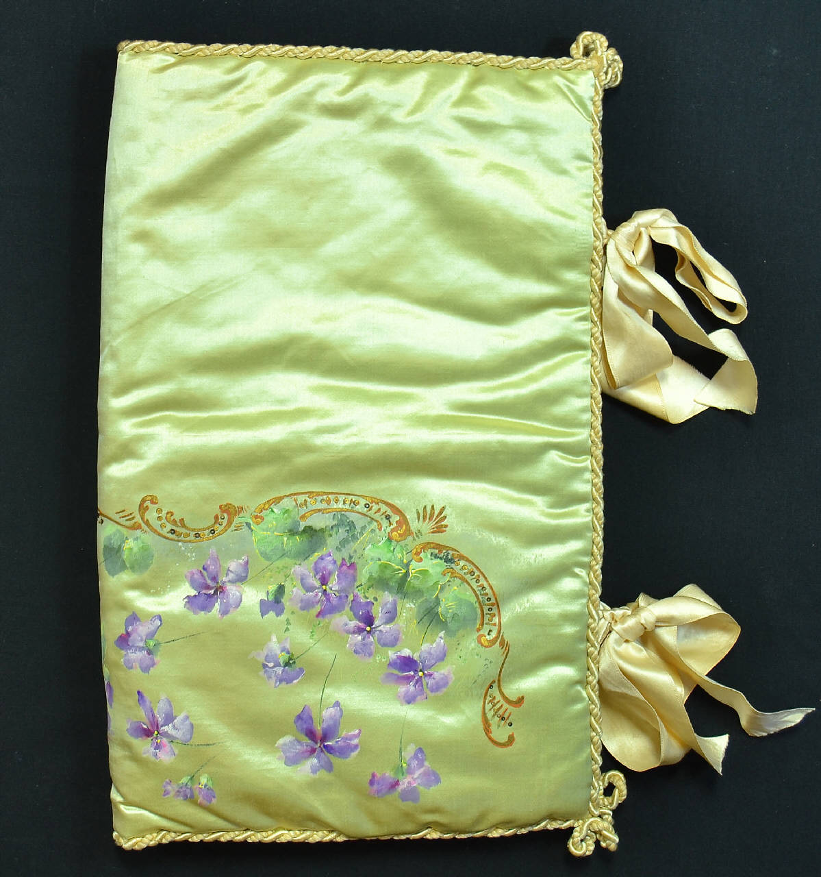 portafazzoletti o portabiancheria a libro, in raso verde acqua con decoro dipinto: nell'angolo cornice dorata a volute punteggiata da paillettes dorate e violette con foglie, sparse. Profilo del portafazzoletti in cordone avorio che forma cocche agli angoli; interno in raso avorio trapuntato. Chiudibile su due lati con nastri avorio da annodare.
