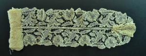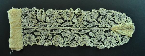 Lunga barba formata da una striscia di merletto, piegata a metà e cucita centralmente; le estremità sono arricciate per formare le stondature. Merlettoa pizzo Rinascimento con nastrino tessuto a margini forati, uniti ad ago con barrette ritorte; motivi di riempimento ad ago. Decoro a steli arcuati con tulipano.\nProfilato da minuto bordo realizzato ad ago che forma minuscoli picot.