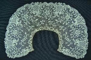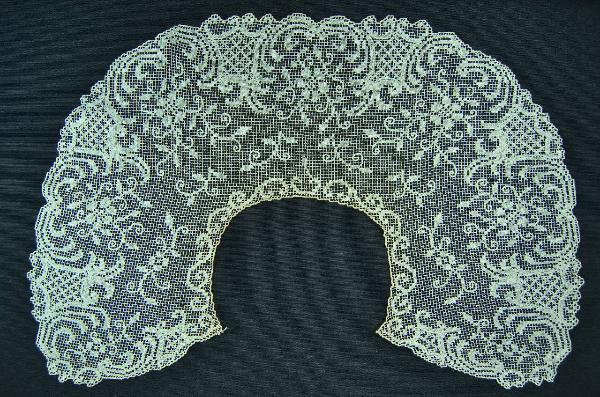 Collo per abito infantile, ampio e piatto, realizzato in filo di lino naturale a filet, con motivi a cartiglio e floreali ricamati a punto tela con vari effetti. Profilato a p. asola.