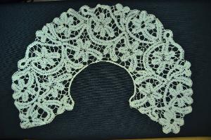 Collo maschile infantile, ampio e piatto, lavorato a fuselli a fili continui, tipo Milano. Nastrino continuo a p. tela con bordi traforati, fondo ad ago a doppie barrette a treccia con picot. Motivo a tralcio serpeggiante che include nelle volute foglie palmate.
