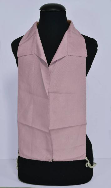Chemisette con davanti e collo in tela di seta (taffetas) rosa antico e dorso in crespo nocciola. Davanti in due pezzi, con apertura centrale chiusa solo in vita da gancio in metallo; girocollo con collo a cinturino alto, stirato con punte aperte ad effetto revers. Il davanti e il dietro non raccordati in vita da elastico.