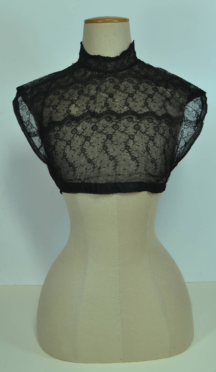 Chemisette nera in tulle bobbinet con ricamo meccanico, doppiato in crespo di seta. Collo a cinturino; davanti formato da tre bande di alto bordo smerlato in tulle ricamato a piccoli motivi floreali, cucite insieme orizzontalmente, doppiate in tulle e crespo. Dietro in tulle e crespo. Apertura posteriore chiusa da automatici sul collo. Davanti e dietro raccordati sui fianchi da fettucce di cotone nero.